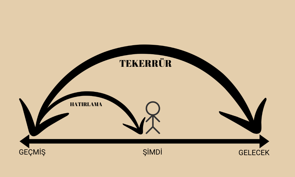 “Hatırlama ve yineleme zıt yönde aynı hareketler” der Kierkegaard. Zıt yönde olması, yineleme/tekerrürün geçmişten çıkıp gelecek noktasında varlığa geliyor oluşudur. Yön olarak aynı, nicelik olarak farklı olan iki vektörel nicelik gibi düşünebiliriz. Sıfır noktası olarak şimdi, iki zamansal mefhumunda incelemeye tabi başlangıç noktasıdır.
